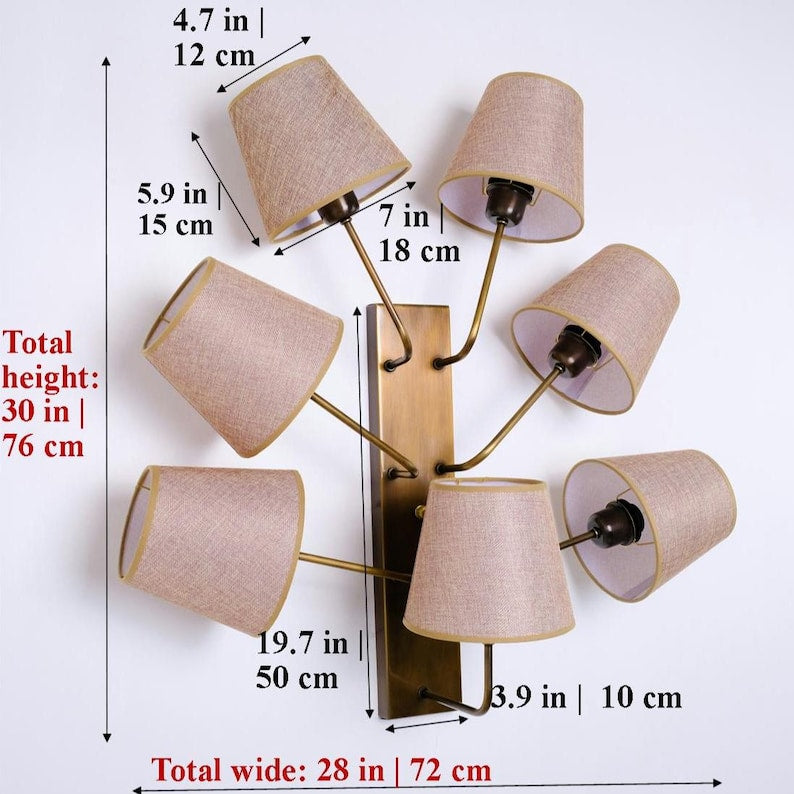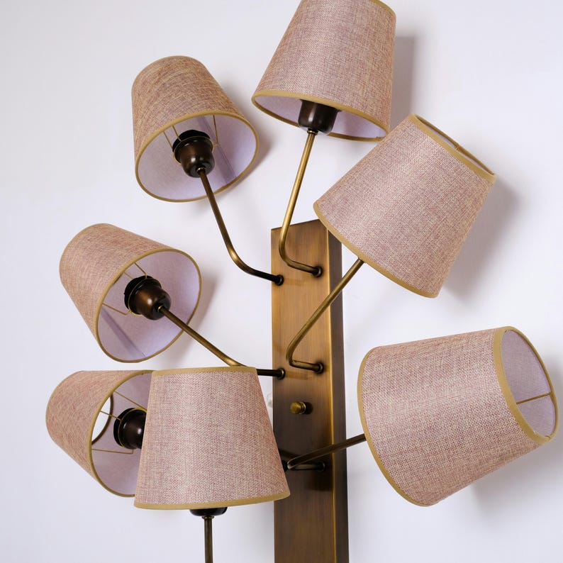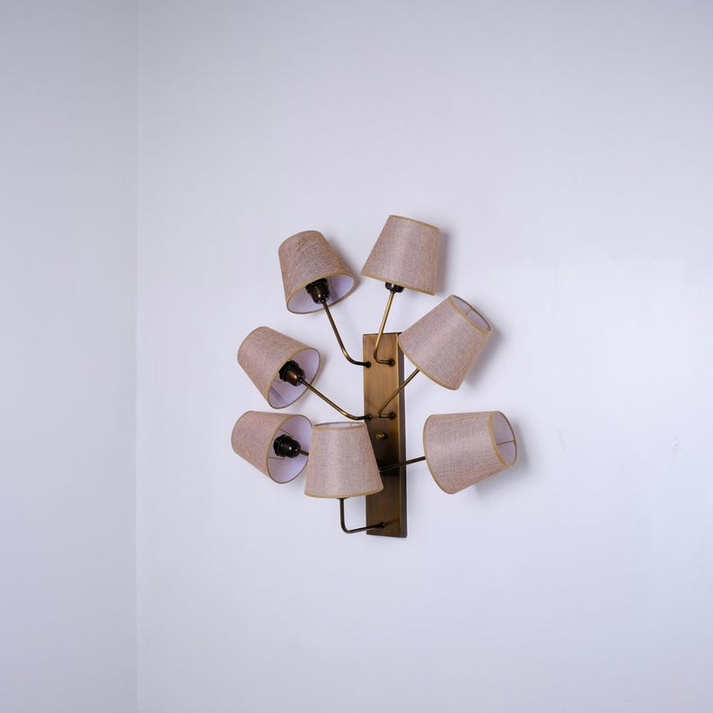 A beautifully handcrafted 7-arm brass wall sconce with soft fabric shades, designed to bring timeless warmth and elegance to your home.
